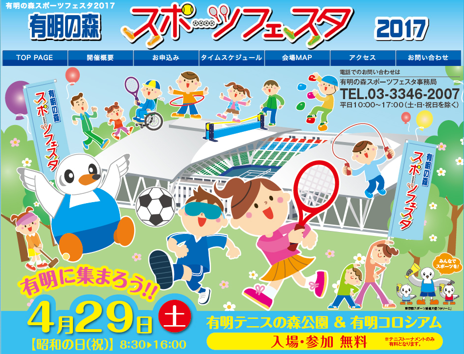 有明の森スポーツフェスタ2017は、有明テニスの森全体で、テニス、ソフトテニス、ランニングなどのスポーツを体験できる参加型イベントです。 テニスではプロによるテニス教室や小さなお子様向けのキッズテニス、大人も楽しいアトラクション、初めてでも安心な体験教室、そしてジュニアの大会が行われます。